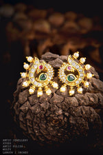 Introducing our exquisite Antique Peacock Stud. Featuring a stunning peacock design with shimmering American diamond, ruby, and emerald color stones, this stud is a true piece of art. Elevate your style and make a statement with this sophisticated and exclusive piece. A perfect addition to your jewelry collection.