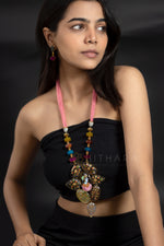 Embrace the beauty of spiritual art with our Onyx Pendant. This exquisite piece features a hand-painted Radha Krishna Tanjore painting, accented with intricate pearls and onyx beads. Add elegance and spirituality to any outfit with this exclusive pendant.